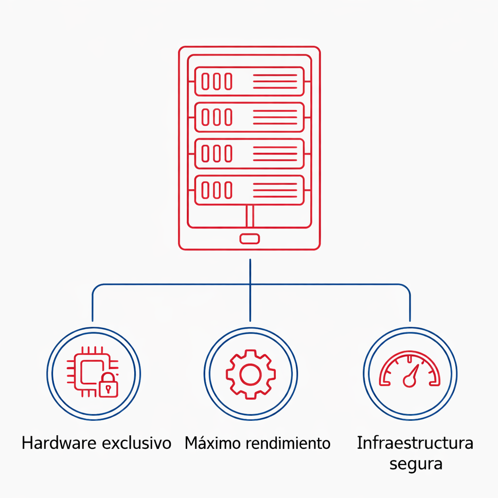 Hardware exclusivo, sin compartir recursos. Máximo rendimiento y personalización. Infraestructura robusta y segura. Pensado para cargas exigentes.